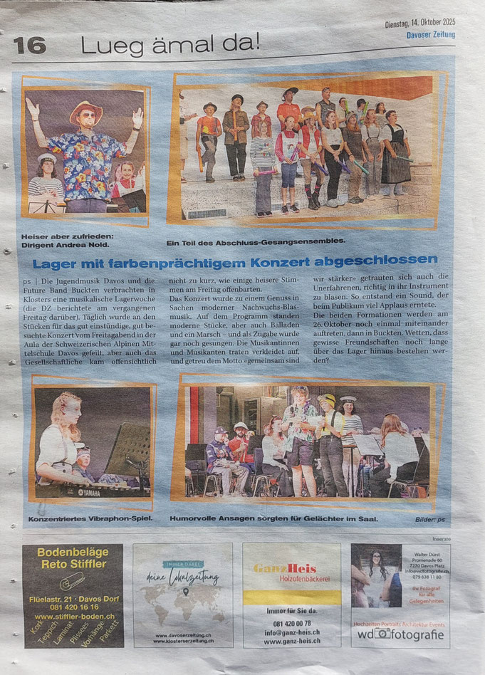 In jugendlichen Jahren schon an einem Kantonalen Jugendmusikfest dabei sein, ist keine Selbstverständlichkeit. Das letzte «Kantonale» fand vor sechs Jahren auf der Lenzerheide statt. Aufmerksam hat auch die JMD die «Konkurrenz» bei ihren jeweiligen Konzerten angehört. Aufgrund des einsetzenden Regens musste die Parademusik auf der Bühne im Saal des Zentrums Glüs ohne zu marschieren präsentiert werden. Den schwung- und klangvollen Darbietungen tat dies jedoch keine Einbusse.